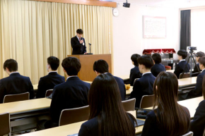 全校朝礼で3年生が医科大学合格体験をスピーチ