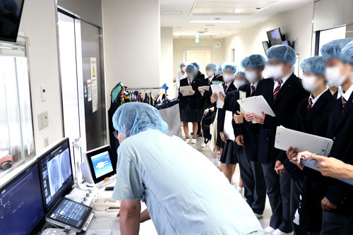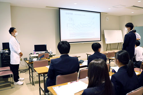 10月20日(月)、第1学年が川崎医科大学総合医療センター見学を行いました。これは本校の総合的な探究の時間「ドクターロード」で行っている教育活動の1つです。まず、本校卒業生の医師道田将章先生と木村美名子先生が施設を案内してくれました。高度医療、総合的な医療、地域医療支援の最前線を見ることで、生徒たちは普段できない体験と深い学びを得ることができました。また先生方の講話を通して、先輩からの言葉に励まされるとともに、高校での学習の大切さを再確認しました。見学に引き続き、精神科学 和迩健太先生の「メンタルヘルスを考える-ストレスと心身のしくみ-」というテーマのMSHの講義を受けました。思春期におけるストレスと心身の関係、そしてメンタルヘルスの重要性についての話でした。先生は、ストレスは誰にでも起こる自然な反応であり、孤立せず、信頼できる人に「話す」ことが心身の健康を保つ鍵であることを強調しました。生徒たちは講演に真剣な態度で臨み、先生の話を熱心に聞いていました。