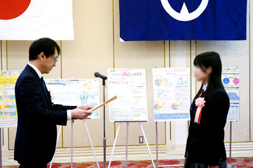 11月17日(月)ピュアリティまきびで行われた「岡山県統計グラフコンクール」の表彰式に、本校第3学年の髙畑日奈子さんが出席し、副知事より高校生以上の部の最優秀賞の賞状を授与されました。表彰式に先立って行われた受賞者による作品紹介では、研究テーマ「子宮頸がんワクチンどう変わった?」について、次のようなスピーチを行いました。「このたびはこのような素晴らしい賞をいただき、大変うれしく思います。中学3年生のときに調べた子宮頸がんワクチンの接種状況が気になって、今回新たに調べてみることにしました。3年たってキャッチアップ接種や定期接種が開始され、受けた人が増えていることがわかりました。同じテーマを継続して調べることで、グラフに示されている変化をより実感することができました。継続的に経過を調べることが重要なことだと今回よくわかりました。今後も統計グラフの勉強を続けていきたいと思います。」