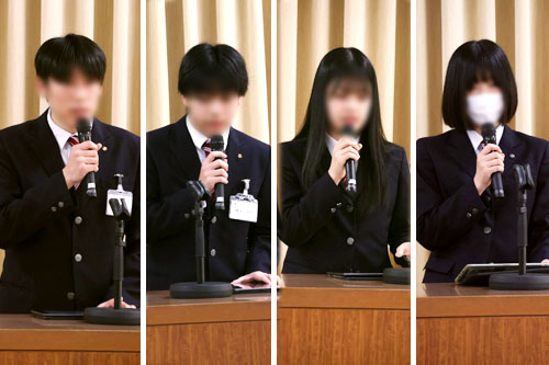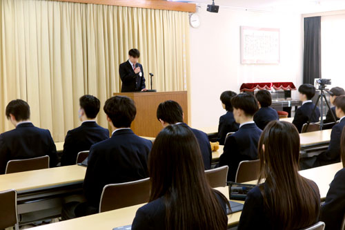 2月9日(月)、全校朝礼において3年生(54期生)の代表4名が医科大学合格体験をスピーチしました。このスピーチは、下級生たちの今後の学習の指針にしてもらうことを目的としており、発表者は自分の受験勉強を振り返って、工夫した点や有効だった学習方法を後輩に伝えました。