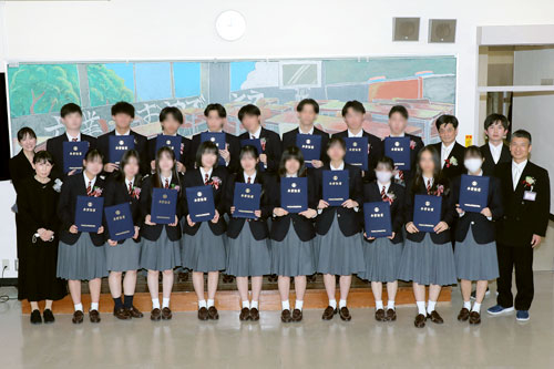 3月3日(火)、春の旅立ちの雨が降る中、卒業生一人ひとりの新たな門出を祝う卒業証書授与式を執り行いました。川﨑誠治理事長を始め、来賓の方々にご臨席いただき、20名の卒業生に竹田義宣校長より卒業証書が授与されました。3箇年皆勤賞1名、3箇年精勤賞5名、卒業記念品受領の後、校長式辞、在校生代表の送辞、卒業生代表の答辞を行いました。閉式の後、卒業生による感謝の思いを伝えるための合唱「サザンカ」が披露され、その後拍手に送られながら学び舎を後にしました。