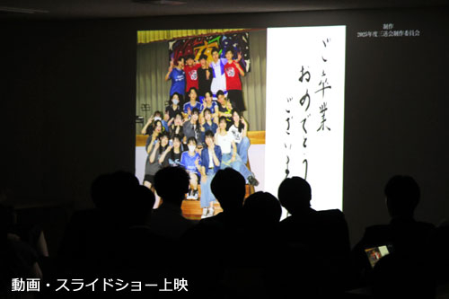 卒業式前日の3月2日(月)放課後、生徒会主催による「3年生を送る会」を開催しました。会では、生徒会が制作した先生・生徒からのメッセージ動画、先生・生徒が出演する「トイ・ストーリー」のパロディ動画、3年生の思い出のスライドショーを1本にまとめ上映しました。3年生に感謝を伝えるよう演出に工夫を凝らした映像で、会場は笑いと感動に包まれました。上映後は、全学年で教員も一緒に会食会を楽しみ、最後に3年生代表から大学生活への決意が述べられました。
