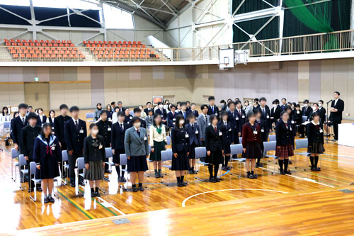 4月9日(木)、第57回入学式を挙行しました。27名の新入生は、呼名に応じて返事をして起立し、竹田校長より入学を許可されました。式辞において校長は、「一人ひとりが、附属高校『チーム57期生』として成長し、この生坂での生活に愛着と誇りを持つことのできる3年間にしていきましょう」と述べました。その後、新入生代表による宣誓が行われ、在校生代表より歓迎の言葉が贈られました。