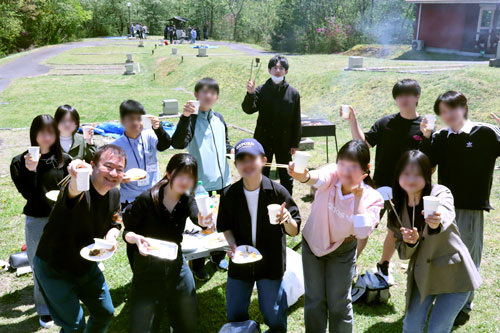 4月16日(木)、生徒会主催の新入生歓迎行事として、本校の伝統である学年縦割り班(教員を含む)による飯盒炊さんを行いました。晴天に恵まれた中、各班が上級生をリーダーとして協力し、薪割りから調理まで主体的に取り組みました。バーベキューや焼きそば、ペッパーランチ風ごはんなど、班ごとに工夫を凝らしたメニューが並び、和やかな雰囲気の中で活動が進められました。