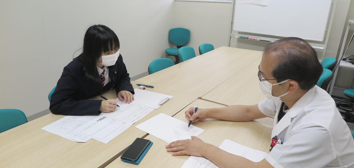 1年次に生徒自らが診療科を選択し、質問事項を考えて、川崎医科大学附属病院・川崎医科大学総合医療センターの医師に1対1でのインタビューを行います。